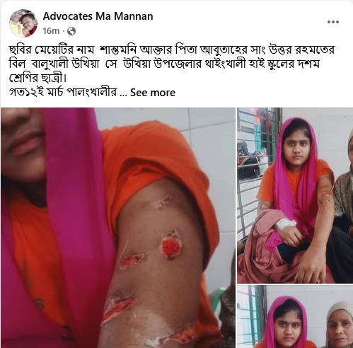 এদিকে, ঘটনার প্রায় দুই সপ্তাহ পরও শান্তমনির শারীরিক অবস্থার উন্নতি হয়নি। গুরুতর আহত অবস্থায় তাকে হাসপাতালে ভর্তি করা হয়েছে। নির্যাতনের চিহ্ন এখনও স্পষ্ট রয়েছে বলে জানিয়েছেন সংশ্লিষ্টরা।