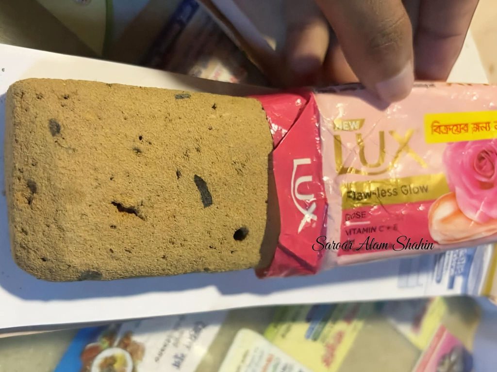 সম্প্রতি পাওয়া একটি চিত্র এই প্রতারণার প্রকৃত রূপ উন্মোচন করেছে। বাইরে থেকে সম্পূর্ণ আসল ব্র্যান্ডের মতো দেখালেও ভেতরে পাওয়া গেছে নিম্নমানের উপাদান—কখনো মাটি, কখনো অচেনা রাসায়নিক মিশ্রণ। “Lux” নাম ব্যবহার করে বিক্রি হওয়া একটি সাবান ভেঙে দেখা গেলে ভেতরে মাটির মতো পদার্থ পাওয়া গেছে, যা জনস্বাস্থ্যের জন্য মারাত্মক ঝুঁকিপূর্ণ।